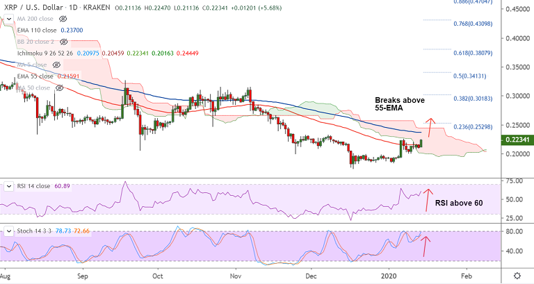 XRP/USD was trading 4.30% higher on the day at 0.2205 at 09:25 GMT, bias turns bullish.