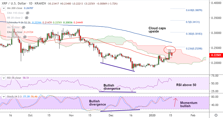 Breakout at cloud eyes 23.6% Fib at 0.2529. Further bullish momentum can take the pair higher to test 200-DMA at 0.2678.