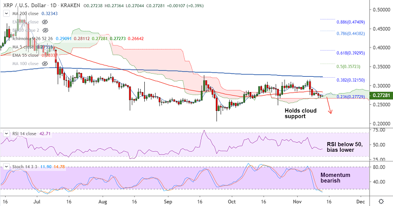 XRP/USD consolidates below 100-DMA, bias remains bearish.