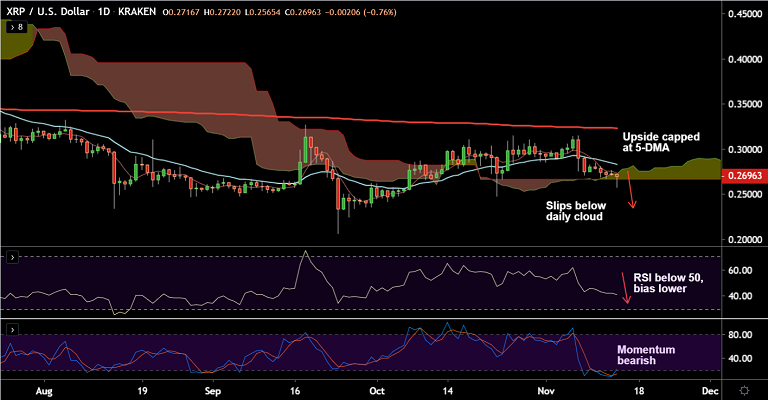 The pair slipped below daily cloud to hit fresh 3-week lows at 0.2565 before paring some losses to trade at 0.2686 at 05:55 GMT.