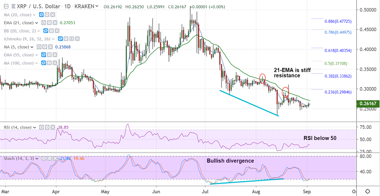 A bullish divergence keeps scope for some upside in the pair. Breakout above 21-EMA could see minor gains.