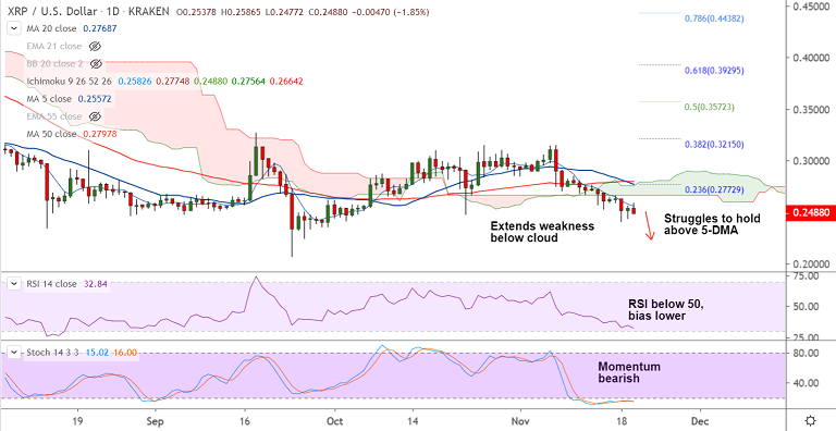 XRP/USD was trading 2.23% lower on the day at 0.2478 at 10:30 GMT, bias strongly bearish.