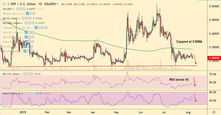 XRP/USD is extending weakness for the second straight session, bias is turning bearish.