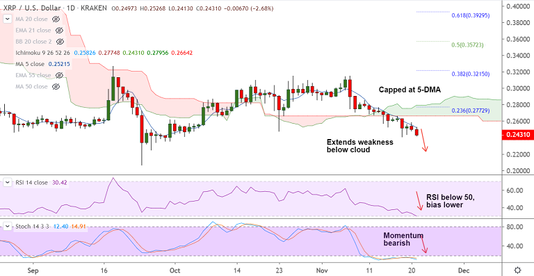 XRP/USD was trading 2.67% lower on the day at 0.2431 at 11:30 GMT, bias strongly bearish.