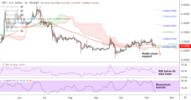 XRP/USD posts minor pullback from fresh 3-week lows at 0.2680, bias remains bearish.