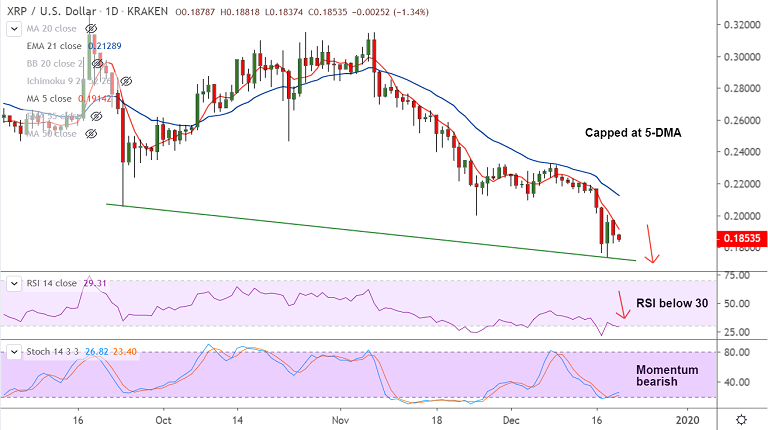 5-DMA is immediate resistance at 0.1914. Break above 21-EMA (0.2128) required for near-term trend reversal.