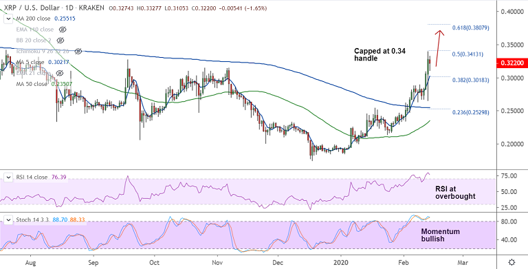 XRP/USD has paused upside at 0.34 handle, bias remains bullish.