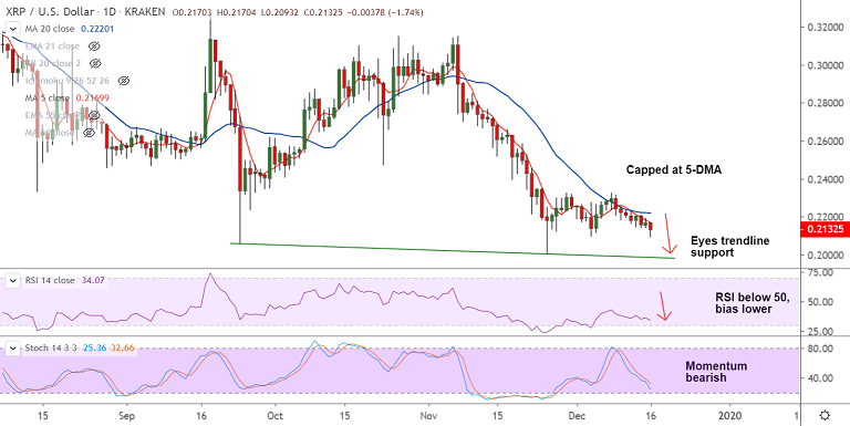 XRP/USD was trading 1.74% lower on the day at 0.2132 at 06:10 GMT, after hitting session lows at 0.2093.