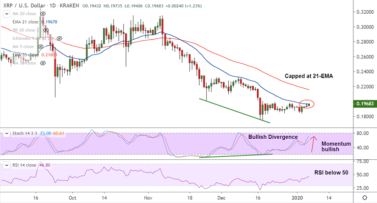 XRP/USD was trading 1.12% higher on the day at 0.1966 at 07:10 GMT, bias neutral.