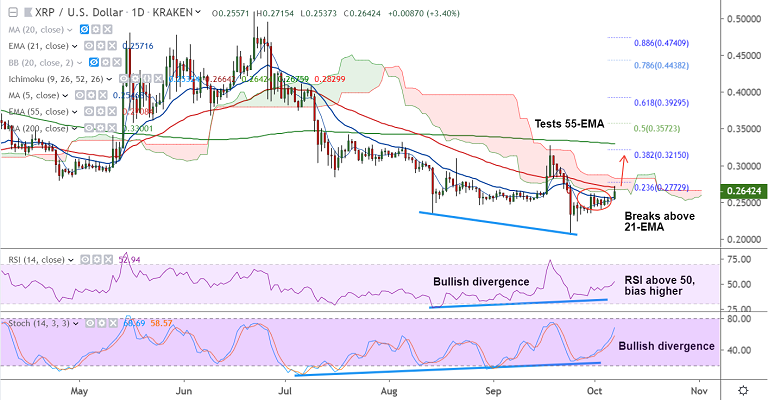 XRP/USD was trading 3.64% higher on the day at 0.2646 at 05:20 GMT, bias turning bullish.
