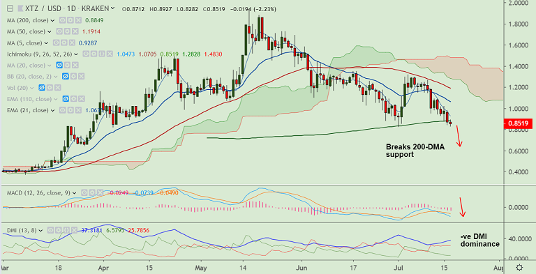 Tezos has resumed downside after brief consolidation below 200-DMA.