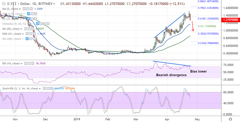 - XTZ/USD dives 12.5% on the day, trades at 1.27 at 1050 GMT