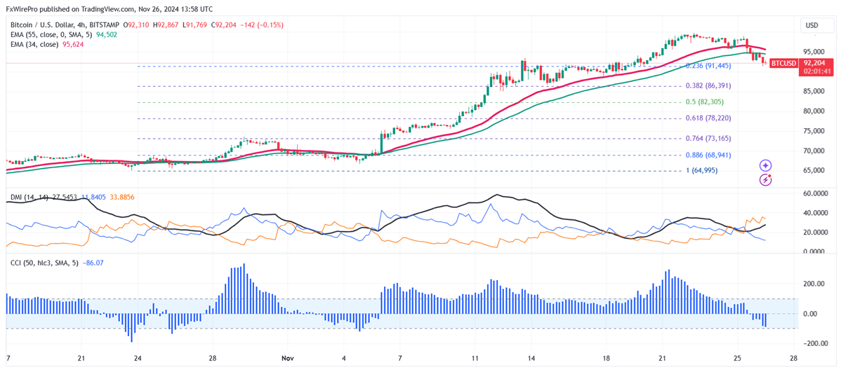 BTCUSD trades above the short-term moving averages (34-EMA and 55-EMA) and the long-term moving average (200-EMA) on the daily chart. Minor support is at $91,445; any break below this level will target $90,000, $86,300, $80,000, or $75,800.