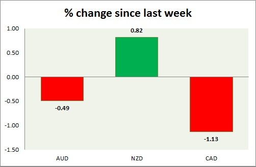 Strength meter (since last week) – Aussie -0.49%, Kiwi +0.82%, Loonie -1.13%