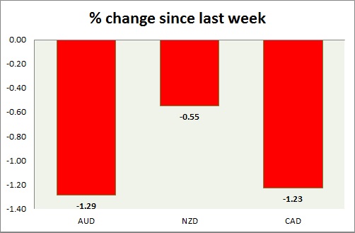Strength meter (since last week) – Aussie -1.29%, Kiwi -0.55%, Loonie -1.23%