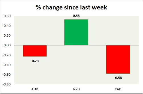 Strength meter (since last week) – Aussie -0.23%, Kiwi +0.53%, Loonie -0.58%