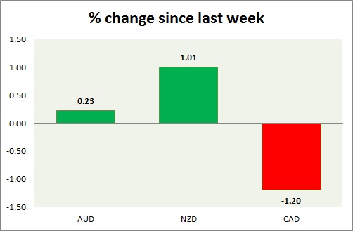 Strength meter (since last week) – Aussie +0.23%, Kiwi +1.01%, Loonie -1.20%
