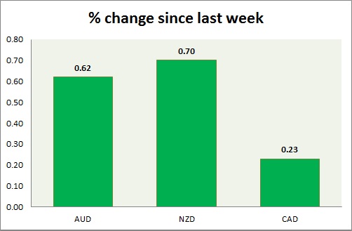 Strength meter (since last week) – Aussie +0.62%, Kiwi +0.70%, Loonie +0.23%