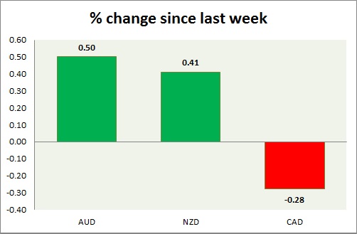 Strength meter (since last week) – Aussie +0.50%, Kiwi +0.41%, Loonie -0.28%