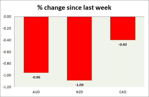 Strength meter (since last week) – Aussie -0.96%, Kiwi -1.09%, Loonie -0.40%