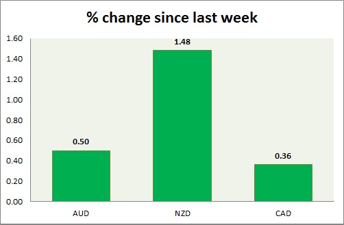Strength meter (since last week) – Aussie +0.50%, Kiwi +1.48%, Loonie +0.36%