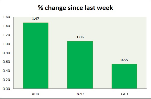 Strength meter (since last week) – Aussie +1.47%, Kiwi +1.06%, Loonie +0.55%