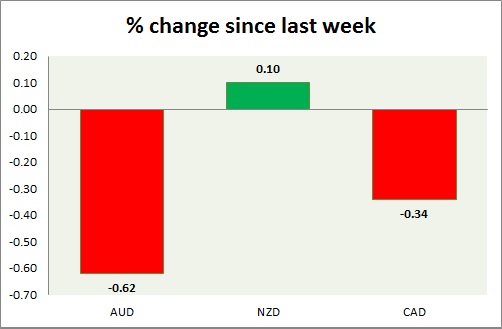 Strength meter (since last week) – Aussie -0.62%, Kiwi +0.10%, Loonie -0.34%
