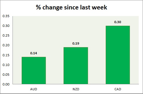 Strength meter (since last week) – Aussie +0.14%, Kiwi +0.19%, Loonie +0.30%