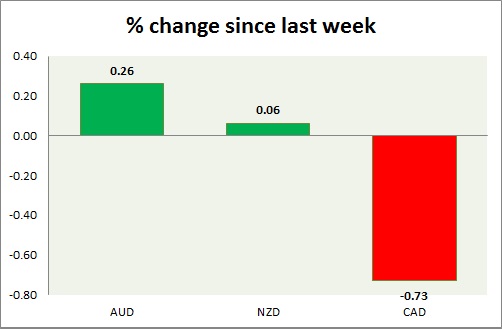 Strength meter (since last week) – Aussie +0.26%, Kiwi +0.06%, Loonie -0.73%
