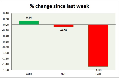 Strength meter (since last week) – Aussie +0.14%, Kiwi -0.08%, Loonie -1.48%