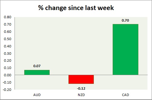 Strength meter (since last week) – Aussie +0.07%, Kiwi -0.12%, Loonie +0.70%