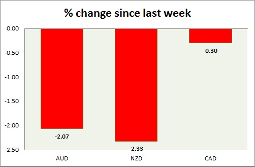 Strength meter (since last week) – Aussie -2.07%, Kiwi -2.33%, Loonie -0.30%