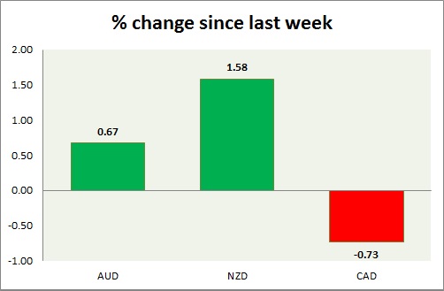 Strength meter (since last week) – Aussie +0.67%, Kiwi +1.58%, Loonie -0.73%