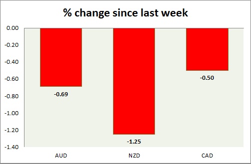 Strength meter (since last week) – Aussie -0.69%, Kiwi -1.25%, Loonie -0.50%