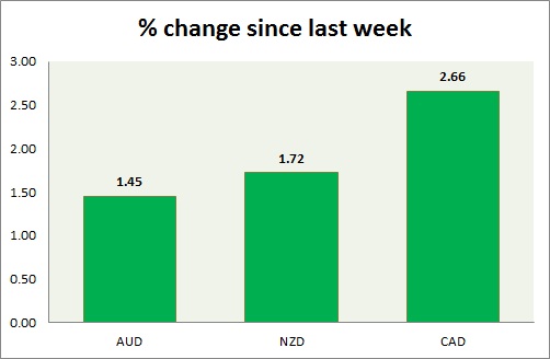 Strength meter (since last week) - Aussie -2.11%, Kiwi -0.79%, Loonie +0.34%.