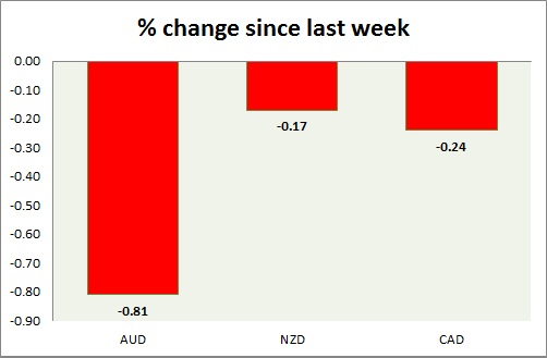 Strength meter (since last week) - Aussie -0.81%, Kiwi -0.17%, Loonie -0.24%.