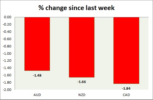 Strength meter (since last week) - Aussie -1.48%, Kiwi -1.66%, Loonie -1.84%.