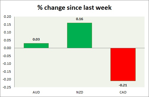 Strength meter (since last week) - Aussie +0.03%, Kiwi +0.16%, Loonie -0.21%.
