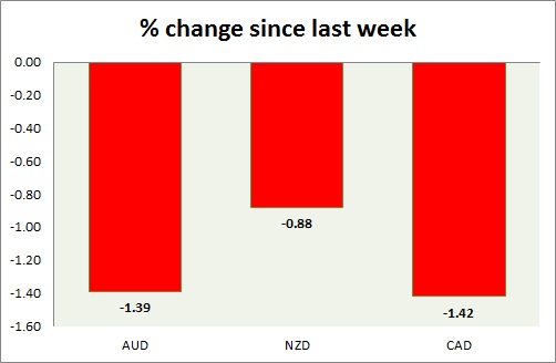 Strength meter (since last week) - Aussie -1.39%, Kiwi -0.88%, Loonie -1.42%.