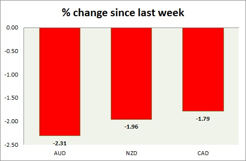 Strength meter (since last week) - Aussie -2.31%, Kiwi -1.96%, Loonie -1.79%.