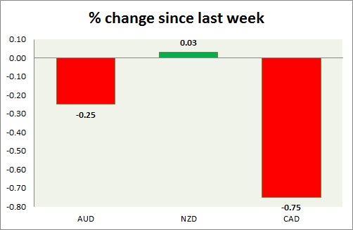 Strength meter (since last week) - Aussie -0.25%, Kiwi +0.03%, Loonie -0.75%.