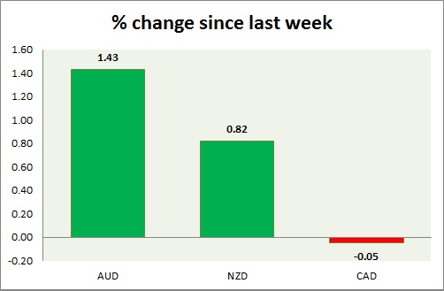 Strength meter (since last week) - Aussie +1.43%, Kiwi +0.82%, Loonie -0.05%.