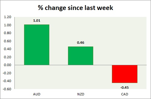 Strength meter (since last week) - Aussie +1.01%, Kiwi +0.46%, Loonie -0.45%.