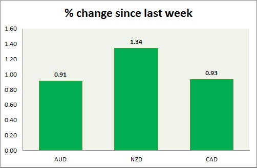 Strength meter (since last week) - Aussie +0.91%, Kiwi +1.34%, Loonie +0.93%.