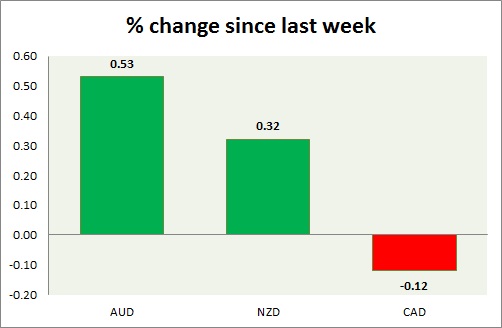 Strength meter (since last week) - Aussie +0.53%, Kiwi +0.32%, Loonie -0.12%.