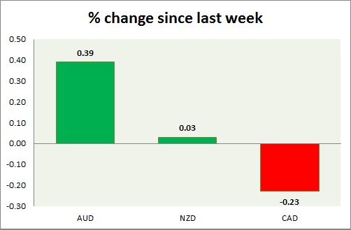 Strength meter (since last week) - Aussie +0.39%, Kiwi +0.03%, Loonie -0.23%.