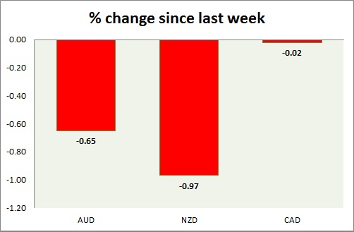 Strength meter (since last week) - Aussie -0.65%, Kiwi -0.97%, Loonie -0.02%.