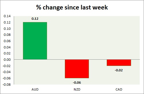 Strength meter (since last week) - Aussie +0.12%, Kiwi -0.06%, Loonie -0.02%.