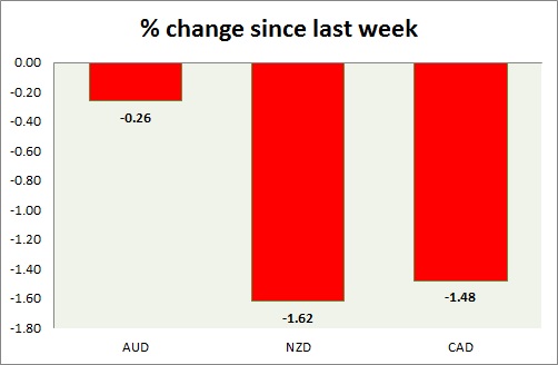 Strength meter (since last week) - Aussie -0.26%, Kiwi -1.62%, Loonie -1.48%.