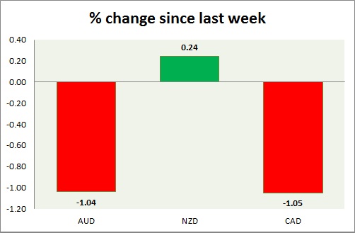 Strength meter (since last week) - Aussie -1.04%, Kiwi +0.24%, Loonie -1.05%.